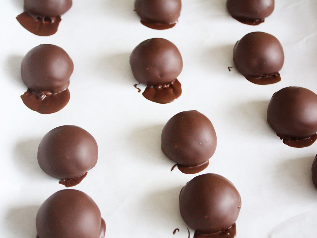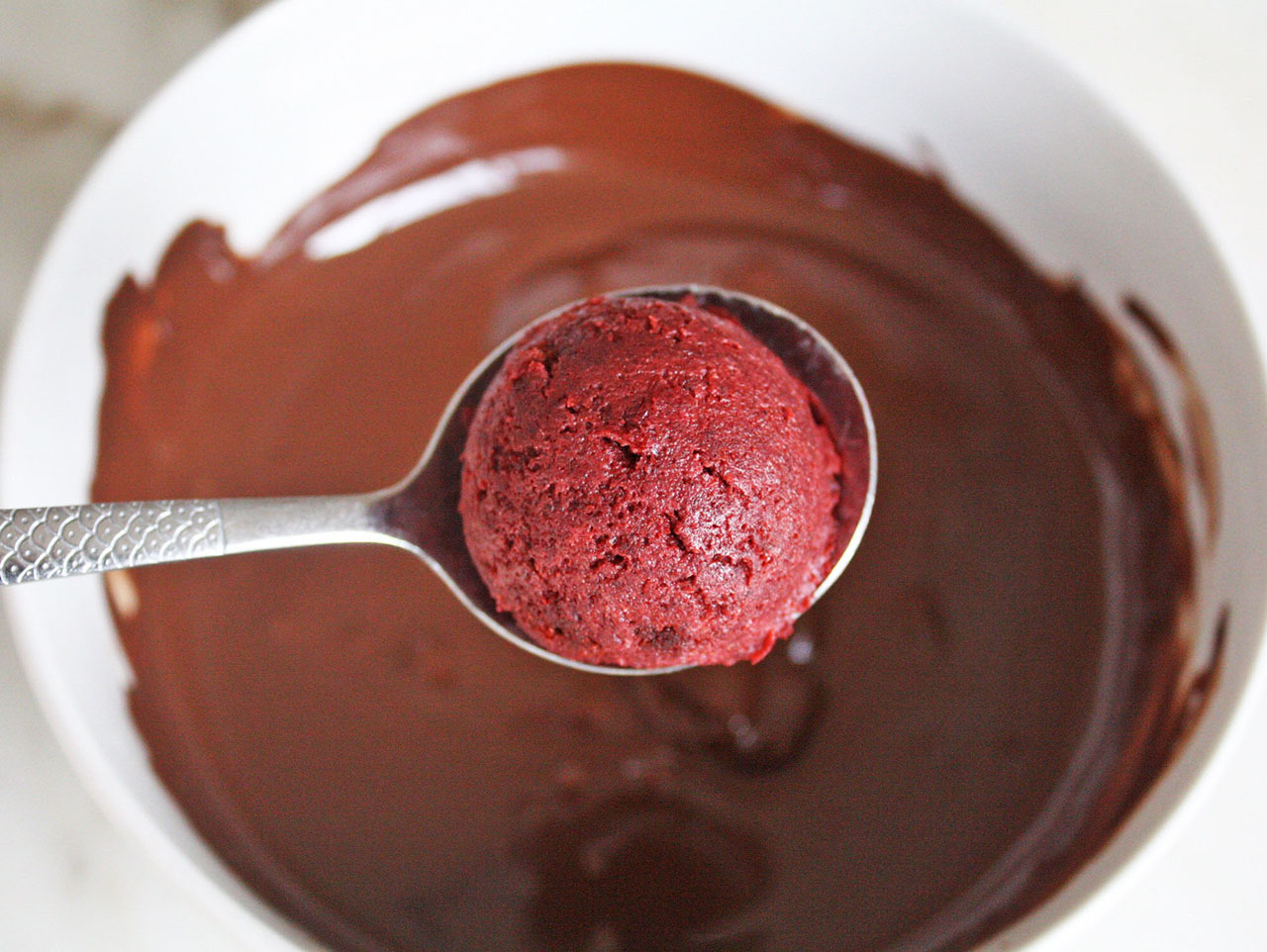 Grab a shallow spoon for dipping. Remove cake bites from freezer and individually dip each one into the melted chocolate with the shallow spoon. Tap off any excess chocolate. Carefully transfer the cake bite back onto the lined baking sheet. Repeat with each cake bite, making sure to move quickly while the cake bites are cold.