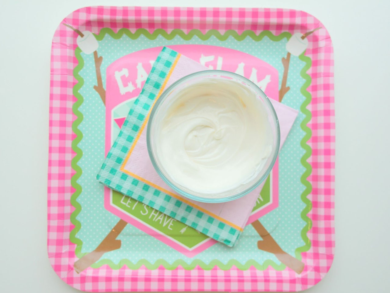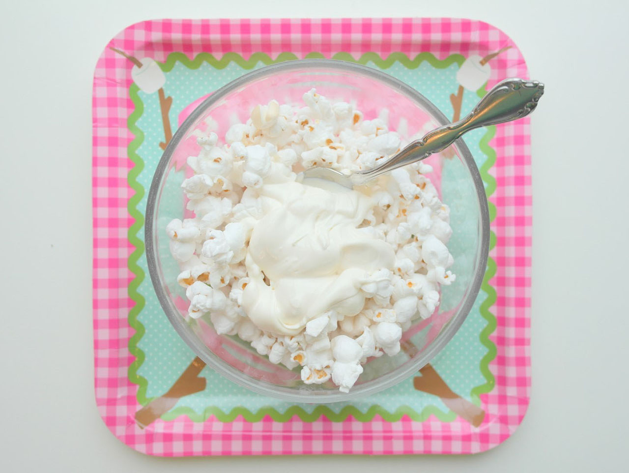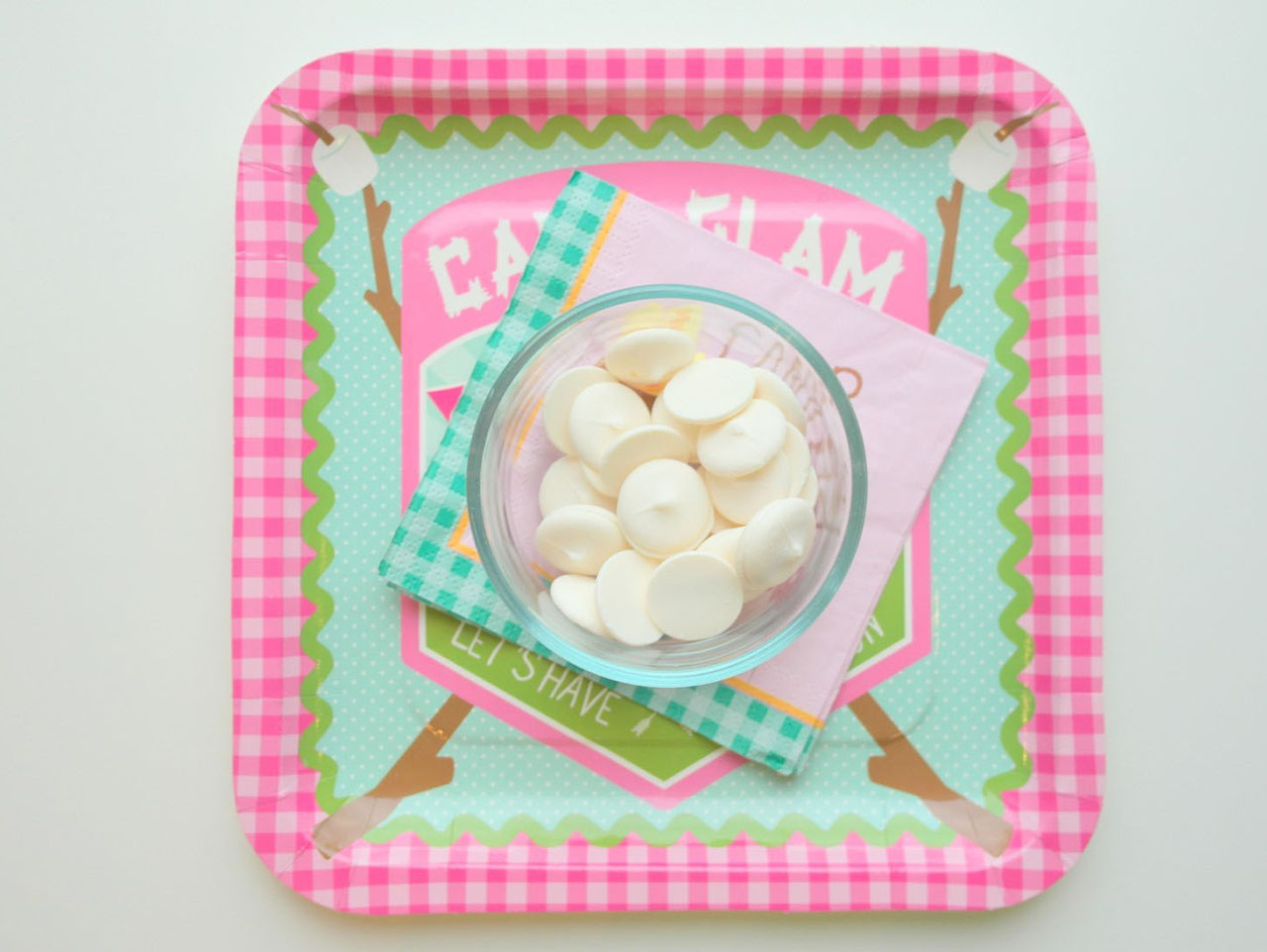 Lastly, spoon your sweetened popcorn mixture into the Camp Glam Treat Stand with Cones centerpiece and display for your guests to grab and go!