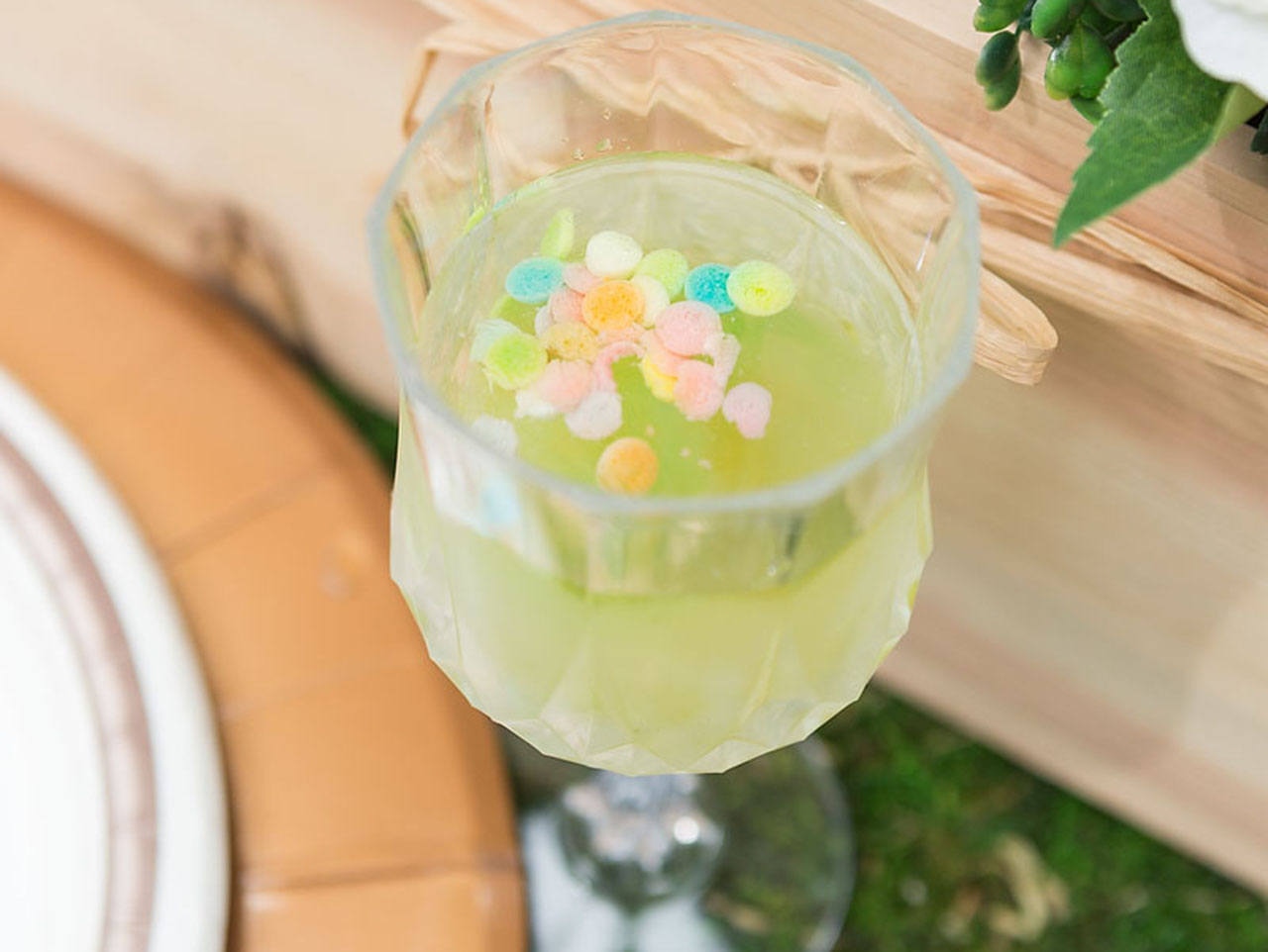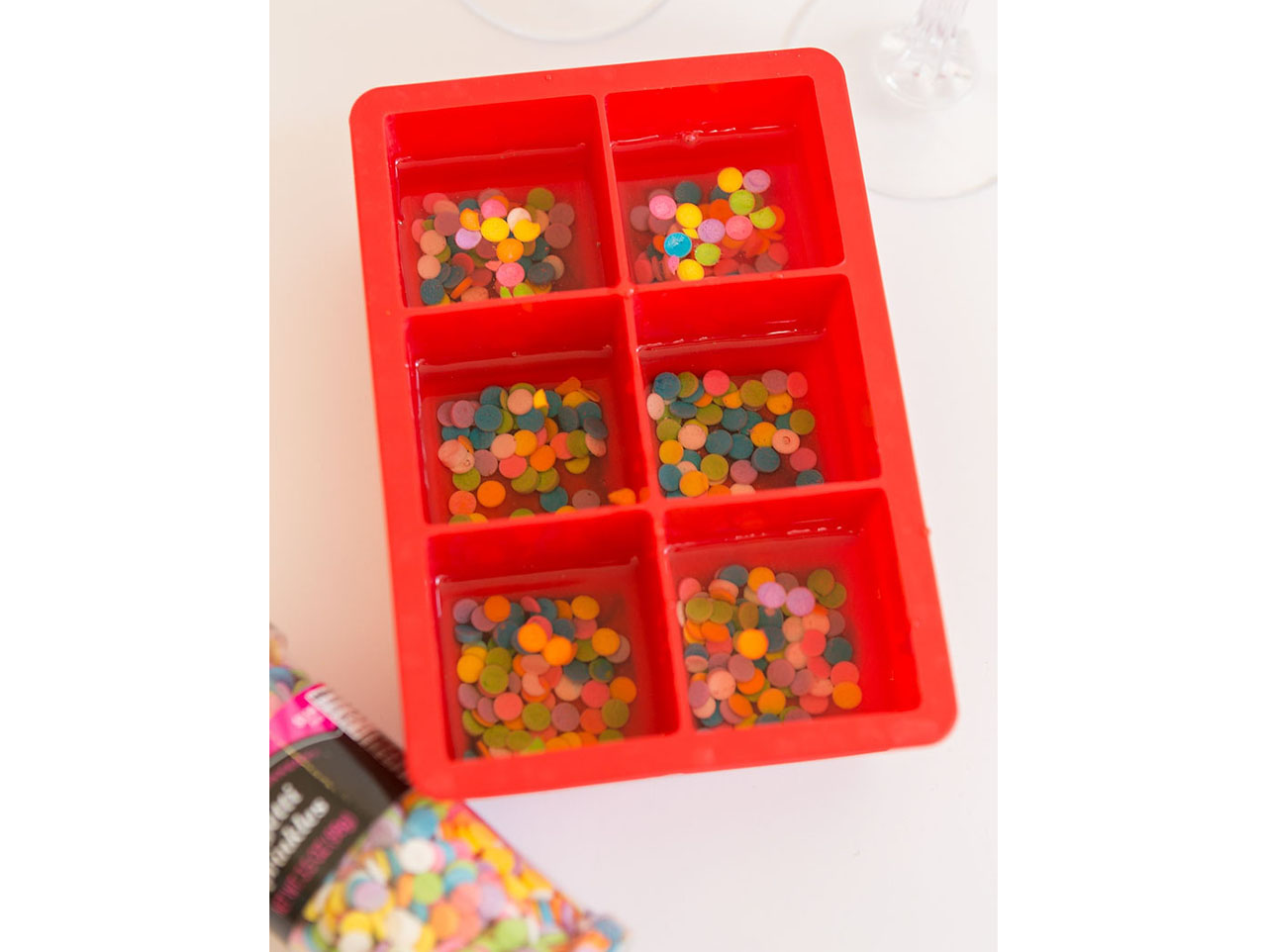 Fill your ice cube tray half way with wine then add in your sprinkles. Place your tray in the freezer for a few hours to firm up. Making these ice cubes in layers helps the sprinkles stay in the middle of the ice cube rather than all floating to the bottom.